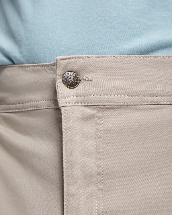 Shorts em tecido elástico. · Cós com 5 passadores. · Dois bolsos laterais embutidos ao longo da costura. · Dois bolsos traseiros embutidos. · Bainha decorativa com costura reforçada. · Etiqueta externa Roly WRK.